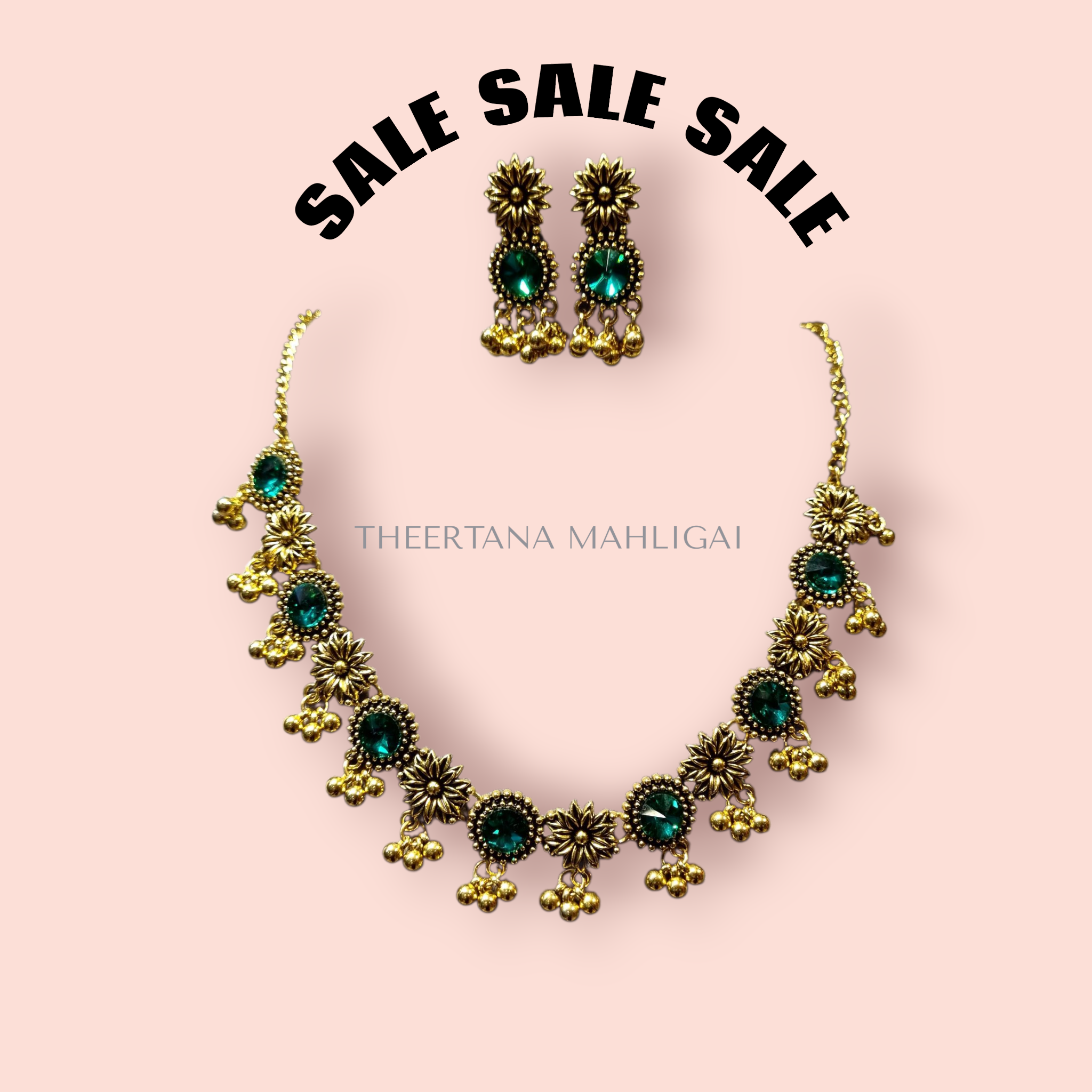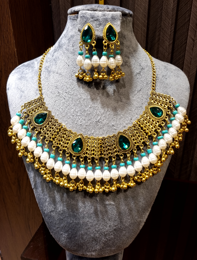 Retro Versatile Green Stone with Pearl Drops Chain + Earrings