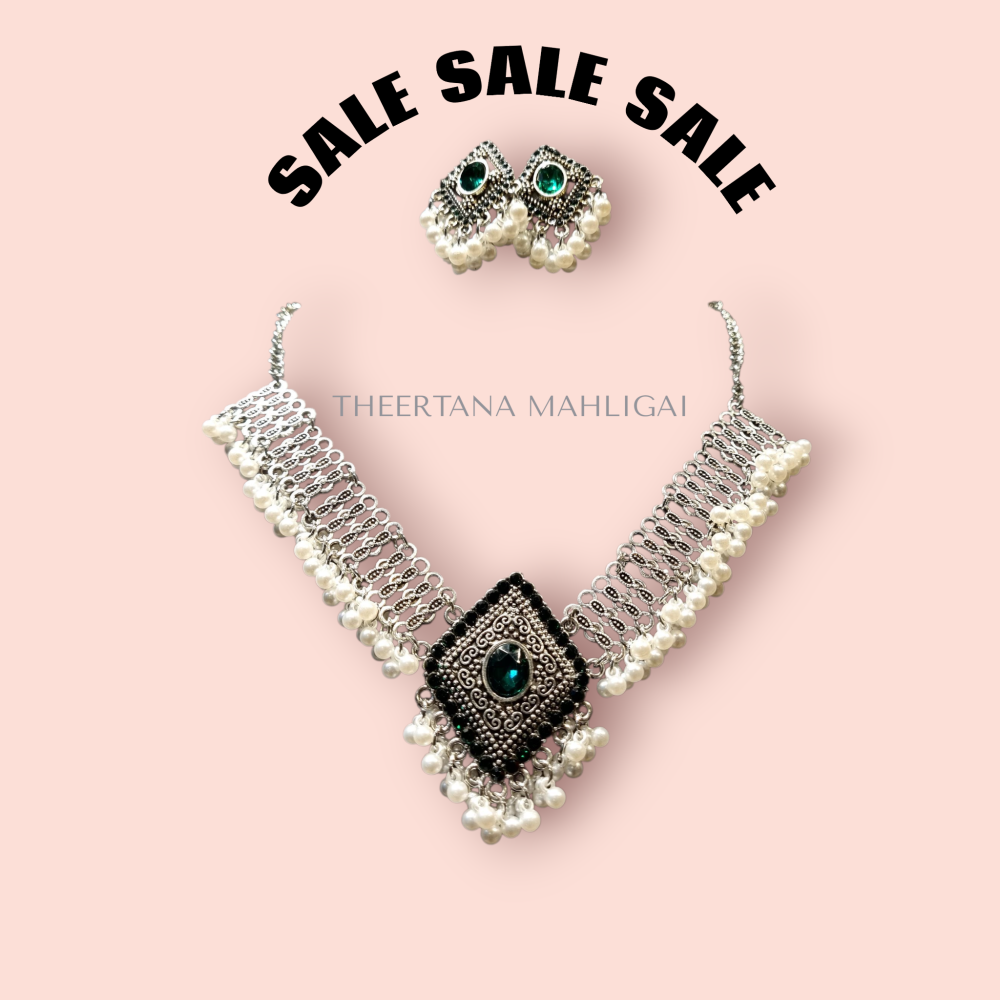 Retro Versatile Green Stone with Pearl Drops Chain + Earrings